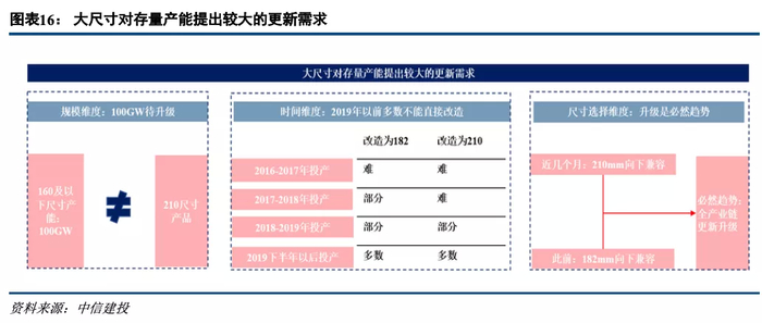 1)从规模维度看,目前市场上约有近100GW 166及以下尺寸的组件/电池片/硅片产能,而大多无法直接升级至210尺寸,因而面临产能更新的硬性需求;