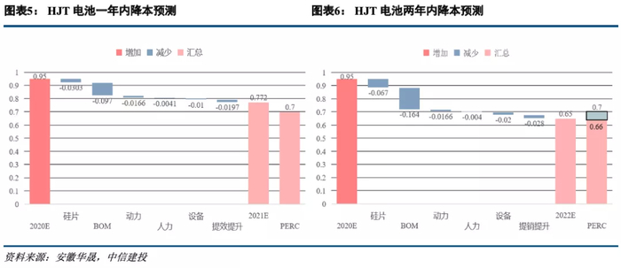 根据我们的持续跟踪,判断2021年HJT每GW的设备投资有望降至4亿甚至更低的水平,2022-2023年有望进一步降至3.5-3亿左右。但由于设备折旧成本在HJT电池每瓦成本里的占比仅5%左右,设备不是决定HJT市场化发展的唯一因素。未来叠加薄片化、银浆耗量及成本的降低、靶材成本的降低及回收、人力成本的降低、转换效率的提升,判断2021年HJT电池的每瓦成本将进一步降低至8毛及以下的水平(PERC目前成本0.66~0.75元/W)。