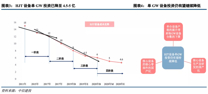 1)就成本而言,HJT设备单GW投资已降至4.5亿元