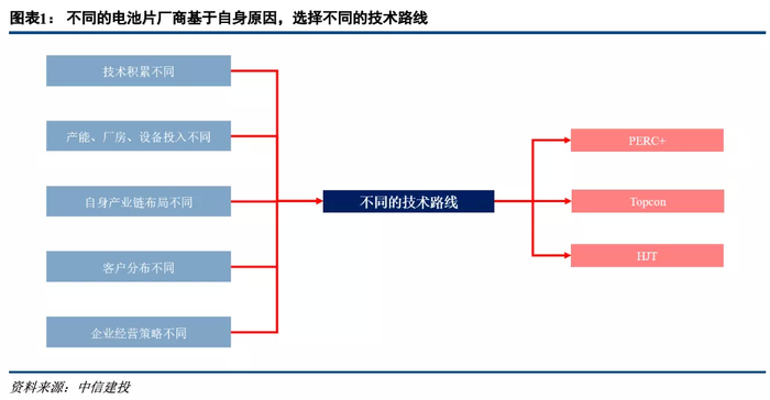 就电池片环节而言,由于不同电池片厂商的技术积累不同、原有产能、厂房、设备的投入不同、自身产业链布局不同、客户分布不同、企业经营策略不同等多方面因素,下游电池片厂商会有不同的技术路线选择。