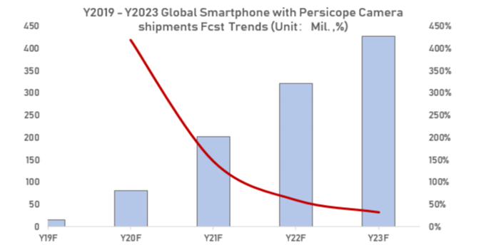 随着潜望式镜头的供应链进一步成熟,零部件成本会进一步下降,从而带动潜望式镜头向中低端智能手机下沉。2020 年全球搭载潜望式镜头的智能手机出货量将达到 8300 万部,并且迎来增长率的高峰,达400%。预期在2023 年有机会突破4 亿部。