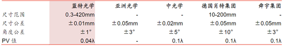 另根据蓝特的招股说明书披露,蓝特在微棱镜领域的尺寸范围、尺寸公差、角度公差及PV指等指标均显著优于同业公司。