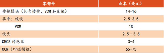 以华为 P30 Pro 为例,包含潜望式镜头的整个后置四摄模组成本约 65-75 美元,其中棱镜模块的价值量高达 14-16 美元,包含棱镜(2.5-3.5 美元)、VCM(10 美元左右)和支架等,镜头价值量约 2.5-3.5 美元,CMOS 传感器价值量约 3-4 美元,考虑算法公司成本,单个潜望式镜头成本约20-30 美元。