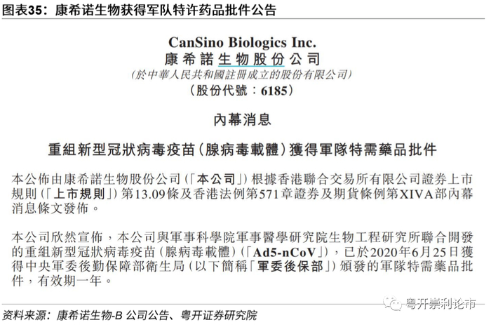 康希诺疫苗已于军队中使用,是目前唯一一款单针疫苗。6月25日,腺病毒疫苗获得中央军委后勤保障部卫生局颁发的军队特许药品批件,有效期一年。根据《中国人民解放军实施办法》规定,Ad5-nCoV现阶段仅限于军队内部使用,未经军委后保部批准,不得扩大接种范围。放眼全球,目前康希诺获得墨西哥3500万剂的公共卫生事件疫苗订单。