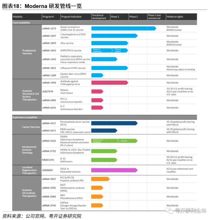 Moderna公司成立于2010年,总部位于美国马萨诸塞州剑桥市。公司专注于信使RNA(mRNA)的研究并致力于成为全球mRNA药物发现和药物开发的先行者和引领者。目前公司的研发管线共有21款疫苗和药物,其中公共卫生事件(SARS-COV-2)疫苗处于临床Ⅲ期,包括巨细胞病毒(Cytomegalovirus)疫苗、个性化癌症疫苗等在内的4款药物处于临床Ⅱ期,8款药物处于临床Ⅰ期。值得一提的是,在公司研发管线中,21款药物中有18款药物和疫苗均为mRNA药物。