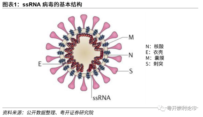 公共卫生事件病毒是一类(+)单链RNA病毒,疫苗研发难度较大。公共卫生事件病毒所包含的单链RNA相当于细胞中的mRNA,可以直接在细胞内翻译出所编码的蛋白质,如衣壳蛋白和病毒的RNA聚合酶。然后在病毒RNA聚合酶的作用下复制病毒RNA,最后病毒RNA和衣壳蛋白自我装配形成成熟的病毒颗粒。与DNA病毒疫苗相比,RNA病毒疫苗的研发更加困难,主要原因在于RNA病毒为单链结构,较双螺旋结构的DNA病毒稳定性差,变异速度更快,突变率更高。例如,SARS样公共卫生事件病毒是一款RNA病毒,经蝙蝠和果子狸传播时,不断发生变异,最终传播至人类,引发“非典”。