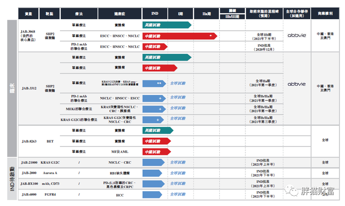 就其研发管线来看,加科思的产品管线共计16项,其中5项适应症共计3个产品进入临床阶段,1项已进入临床Ⅱa期。根据招股书显示,加科思产品线中进展较快的药物开发项目为SHP2抑制剂,包括JAB-3068和JAB-3312,其中JAB-3068已进入IIa期。
