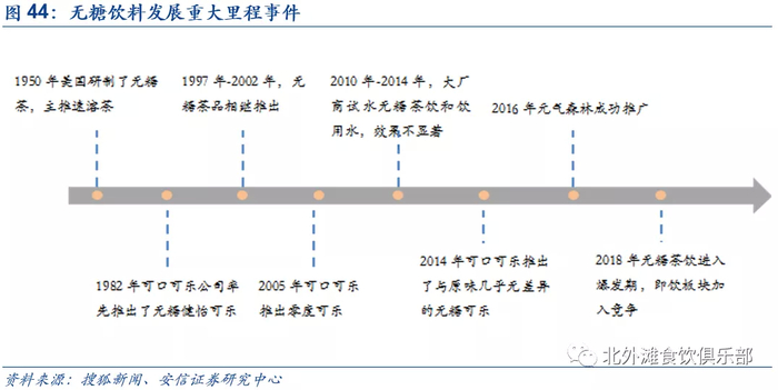 无糖饮料市场在健康消费理念和厂商创新推动下不断完善。1950年美国研制了无糖茶,主推速溶茶,产品以粉剂为主,开启了无糖茶饮新篇章;1982年可口可乐公司率先推出了无糖健怡可乐,标致碳酸饮料步入无糖饮料子行业;1997年-2002年,无糖茶品如三得利乌龙茶相继推出,培养了人们无糖消费的意识;2005年可口可乐进一步推出零度可乐,利用甜味剂取代蔗糖,2010年-2014年,可口可乐、康师傅、天喔茶庄、农夫山泉等厂商相继试水无糖茶饮料,由于市场定位偏离,产品更迭迅速,市场反应不佳;2016年伴随消费者无糖零脂、零卡消费观念增强,元気森林成功推广无糖气泡饮料;2018年无糖茶饮进入爆发期,各大厂商和新兴品牌开始争相瓜分无糖茶饮细分市场,农夫山泉的东方树叶产品培育期长,品牌力强,迅速成为无糖赛道的佼佼者。安信证券预计茶饮料大赛道未来3年增速预计能够实现高单位数增长,主要由无糖茶增速驱动。
