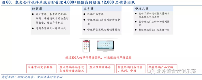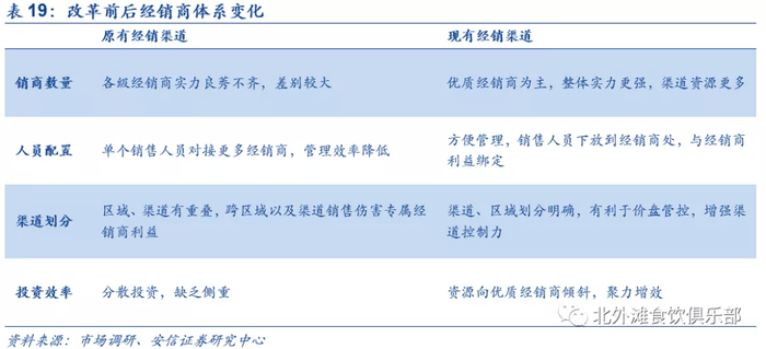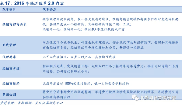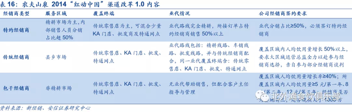 农夫原有经销商体系精耕不足,经销商之间实力参差不齐,并且在区域及渠道上有重叠,容易引发恶性竞争以及“窜货”现象。2016年改革调整后相较于原来有以下几大优势:(1)管理层面,经销商区域划分方便销售人员管理,划清各经销商所属渠道和区域有利于维护价盘的稳定,提高管理效率;(2)ROI层面,公司对优质经销商倾斜更多资源,激励作用更强,这些经销商通常掌握了区域的优质资源,占据了产出较高的头部和腰部核心网点,能够最大化公司的投入产出比;(3)新品推广层面,优质经销商拥有更多的渠道资源,有助于公司新品试验和推广,使得新品铺设更具针对性,从而实现精准投放。
