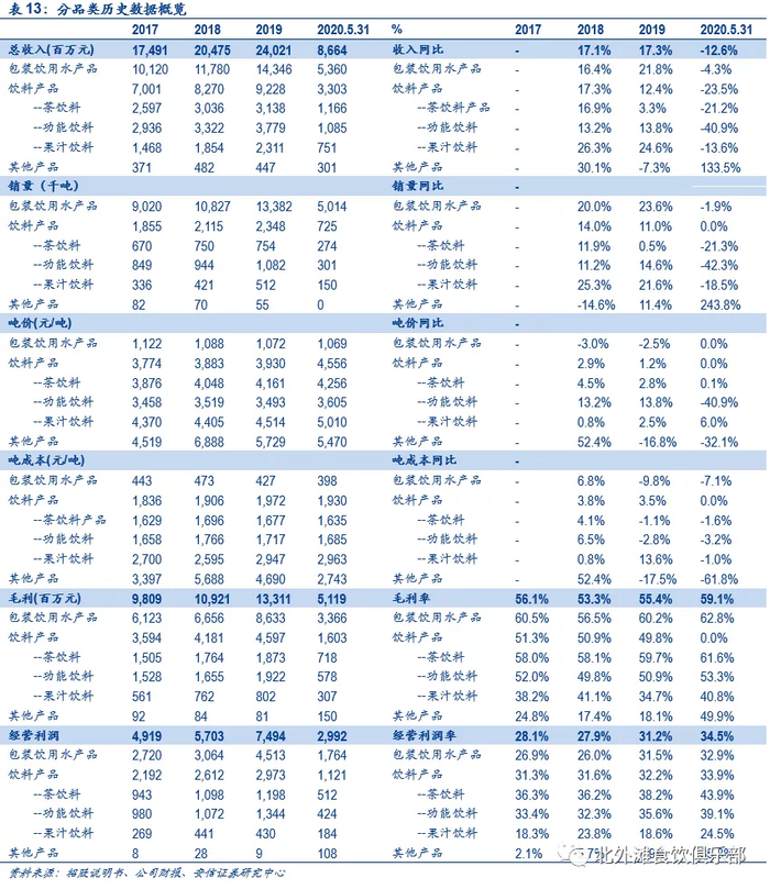 1)大包装水,近年来大包装水增速较快,2020年受卫生事件影响相对较小,截至2020.5.31,公司小规格包装水销量受卫生事件影响同比下滑15.4%,大规格包装水销量同比增23.4%,2017-2019年公司中大规格包装水(1.5L-9L)销售额复合增速达到33%。