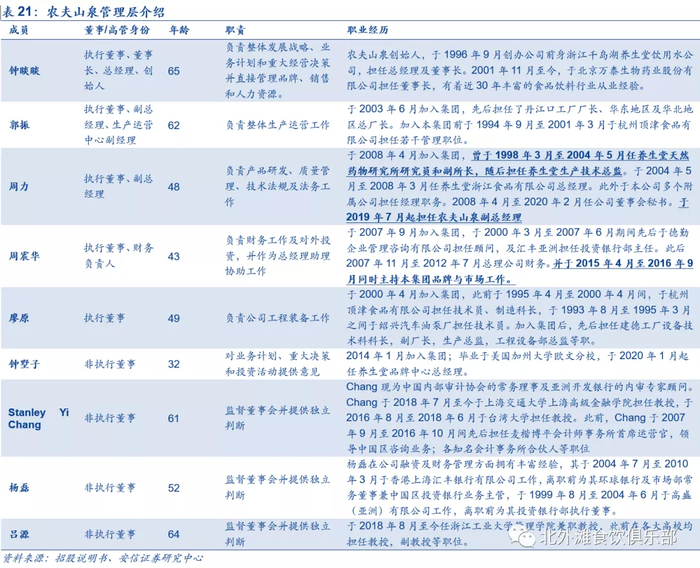 公司目前高级管理层及董事会主要由9人组成,包括了五名执行董事和四名非执行独立董事。钟睒睒为公司创始人,今年65岁,目前担任董事长及总经理的职位,作为上个世纪末的企业家和创业者,他有着独特的品格和韧性,在食品饮料行业耕耘30余载,积累了丰富的经验和商业判断力,他的每一次判断和决策都对公司进一步发展有着积极深远的影响。郭振、周力、周震华、廖原等分别担任公司生产运营、产品、财务、工程部门的负责人,他们在各自的领域都有着丰富的工作经验积累,钟墅子为创始人钟睒睒之子,毕业后加入公司管理层,现任养生堂品牌中心总经理,今年成为农夫山泉董事。公司的三位非执行独立董事,都是目前财务和管理工作的学术研究者,有着丰富的理论知识和实践经验,对公司发展有着导航作用;周力先生经常出席公开场合进行演讲,对公司产品理解深刻,他曾这样介绍品牌“安信证券希望农夫山泉的产品是顶天立地的,比如东方树叶,技术含量到了整个行业的天花板,属于顶天,像种橙树,则又属于立地。两类产品,蕴含着农夫山泉慢跑和快冲的两种经营思考。”
