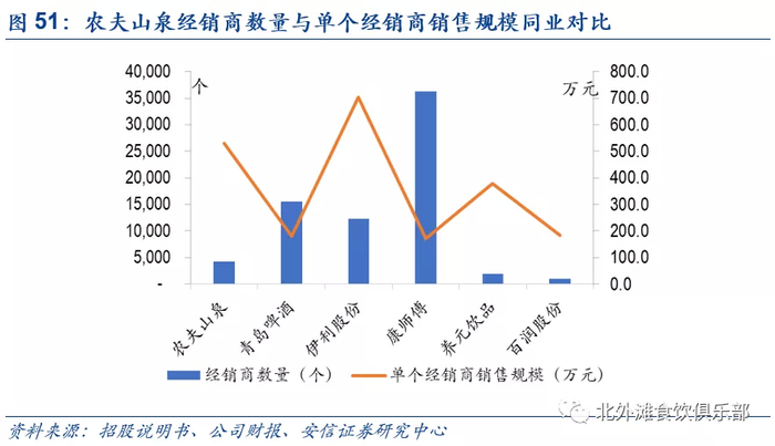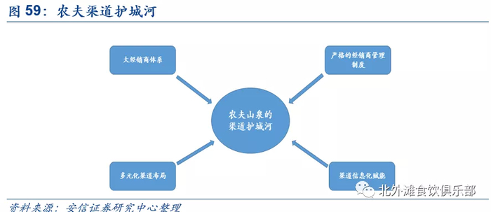 从经销商角度看会优先选择多SKU产品的农夫,经销饮料的利润率较包装水更高,当经销商要按照公司的要求去推广新的品类时,新产品成功的机率也就更高;从终端来看,农夫水和饮料的组合铺货面积更广,终端门店覆盖数量会更多;从消费者角度来看,终端消费者接触农夫产品SKU更多,农夫产品在门店的终端陈列面积更大,消费者有更多机会选择农夫的产品,公司可以针对不同客户需求推出不同产品SKU来获取新客;在推广新品类方面,公司除了在原有传统渠道铺设品类外还会渗透新渠道铺设新品,比如在餐饮渠道铺设产品从而提升销售机会。