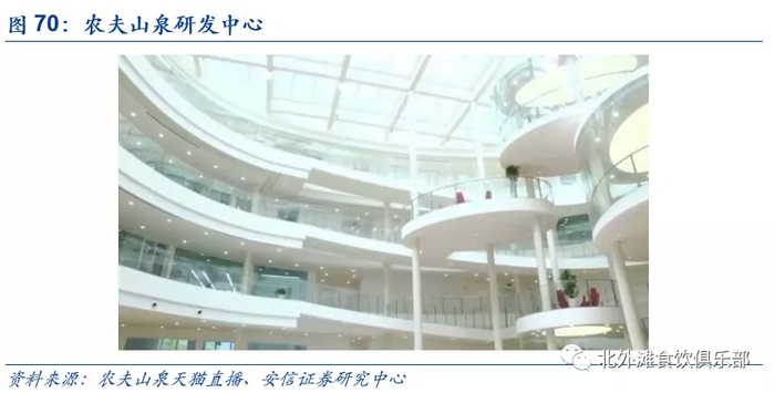 农夫山泉总部一号楼曾经是养生堂和农夫山泉创始人的办公楼,后来秉承着把探索未知、尊重知识的血液流淌到每一个养生堂和农夫山泉员工的骨子里的理念,钟总将这栋楼分给了研发部人员,研发大楼的建筑呈椭圆形,象征着人类知识不断扩充,从农夫山泉的研发中心蕴含的寓意就可以看出公司对于产品研发的重视。