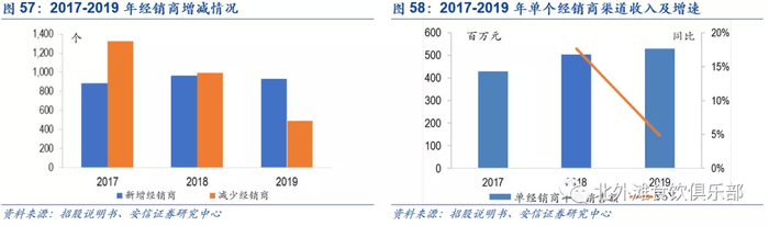 3)进行费用分类,将费用划分为市场费用和渠道费用,渠道费用主要用于经销商完成业绩目标,而市场费用主要用于产品陈列,由公司和经销商共同承担。改革后经销商区域层级划分清晰,积极性被调动,助力公司销售额实现2016-2019年的快速增长。