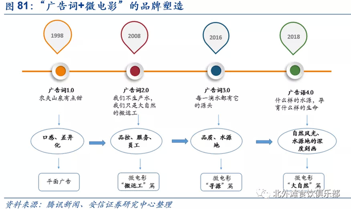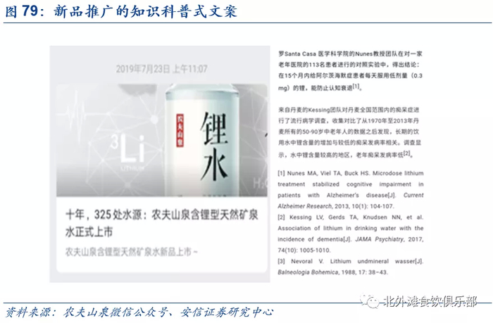 2007年,农夫山泉通过引入水的酸碱性话题挑战行业矿物质水巨头康师傅,“弱碱性水”成为热点,将人们的饮水健康标准提高了一个台阶。农夫山泉是水行业的先行者,通过引入新的标准引领行业的健康发展。在新品推广中,公司通过引用科研论文文献,增加了文案的专业性和严谨性。