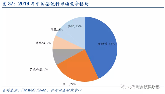 根据公司公开业绩会交流,茶饮料目前是公司第二大重视的品类,茶饮料2019年收入同比增3.3%达到31.4亿元,占收入比为13%,2020H1收入同比下滑10.7%至16亿元,收入占比为14%,其中东方树叶近两年实现了很好的增长,得益于产品的品牌力和行业规模的迅速增长。根据沙利文数据,2019年农夫山泉依靠茶Π、东方树叶两款产品在茶饮料市场市占率达到7.9%,份额次于康师傅和统一,安信证券预计未来仍有进一步提升空间。