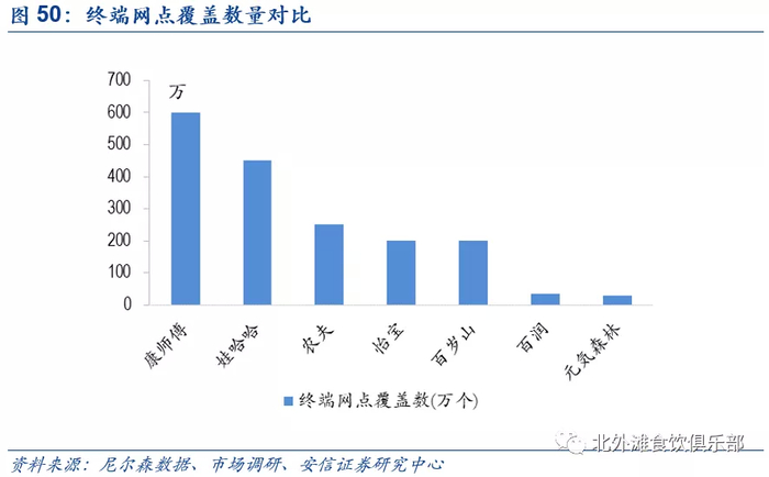 根据调研,康师傅和娃哈哈的网点覆盖数量要高于农夫,怡宝的终端覆盖略微低于公司,对比同行农夫在下线城市市场仍有渗透下沉空间,2020年公司针对县乡情况进行了改革,加强在农村乡镇区域的售后服务,采用二三级经销商进行补充,未来渠道的下沉和覆盖网点数增加将为增长蓄力。