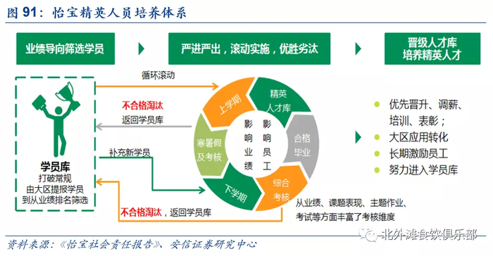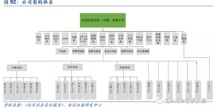 怡宝公司营销中心主要分为市场部、销售管理部、新品开发部等,营销主要按区域划分,全国主要分为华南区域、华东区域、西南区域、湖南大区、江西大区、京津大区、山东大区、辽宁大区、晋翼大区等,公司人才培养体系完善,通过“销售发展之星”培养精英高代人员,采用“严进严出、滚动实施、优胜劣汰”的模式进行教育,对于员工的考核维度包括业绩、课题表现、主题作业、考试等方面。