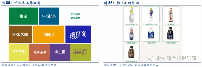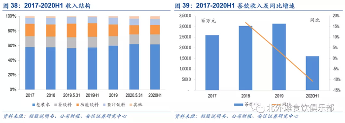 公司茶饮料主要产品包括含糖代表茶Π和无糖代表东方树叶,目前茶Π销售规模约为东方树叶的4倍,1)含糖代表茶Π对标统一小茗同学,2019年茶Π更换新包装增速有所放缓,2019年茶饮料整体销售额增速为3.3%,较2018年16.9%增速放缓;2)无糖茶饮代表东方树叶于2011年推出,随着消费者健康意识觉醒,无糖茶在2018年后成为软饮料的风口浪尖,2018年C-NPS中国顾客推荐度指数榜单显示东方树叶位列无糖茶品类第一名,东方树叶是不含任何添加剂的茶叶浸出液,竞争对手包括元気森林燃茶和三得利等,2019年推出小包装335ml SKU,共有3个口味包括醇香乌龙茶、茉莉花茶和红茶。