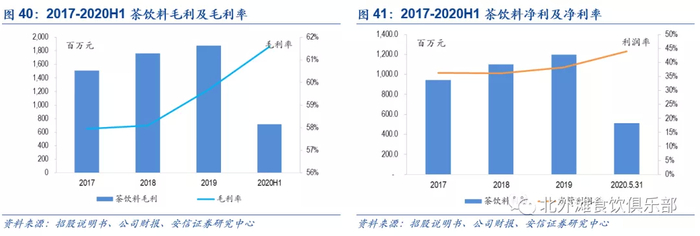 公司饮料业务主要包括果汁饮料、功能饮料、茶饮料等软饮分支,每个品类下又有多个子品牌,2019年茶饮料收入同比增3.3%至31.4亿元,收入占比同比下降1.7pcts至13.1%,毛利率同比提升至59.7%,板块利润率同比增2pcts至38.2%,功能饮料2019年销售额同比增13.8%至37.8亿元,收入占比同比下降0.5pcts至15.7%,毛利率同比提升1.1pcts至35.6%,板块利润率同比增3.3pcts至35.6%,果汁饮料2019年销售额同比增24.6%至23.1亿元,收入占比同比增0.5pcts至9.6%,毛利率同比下降6.4pcts至34.7%,板块利润率同比下降5.2pcts至18.6%。
