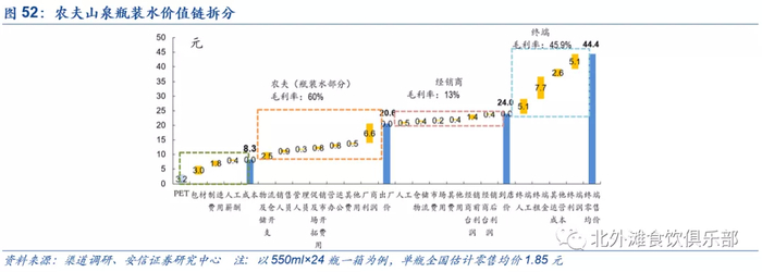 零售2元水价格带定位相较1元给予了渠道更高更合理的利润。终端零售单瓶水的毛利率可以实现约50%,经销商环节单箱水毛利率约为10%-15%,通过搭售饮料组合可以实现更高利润率。由于水的吨价远低于饮品,因此相关的运输费用以及市场投放费用占收入比往往更高,因此饮料通常能带给经销商更高的净利率。经销商在进行瓶装水产品选择时会优先农夫,因为当同价格带的瓶装水毛利率相近时,农夫可以为经销商提供更多市场费用支持,且产品组合更加丰富。总体来看,农夫在经销商渠道的利润率水平较高,对经销商的激励位于行业平均以上水平。