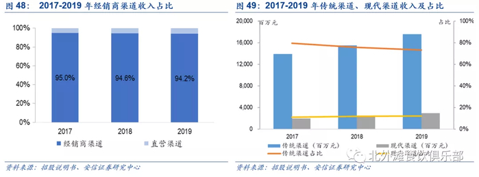 此外,公司通过考虑客户声誉、同公司业务协同性及购买金额等因素确定直营客户,直营客户包括全国或区域性的超市、连锁便利店、电商平台、餐厅、航空公司及集团客户等,截至2020.5.31,公司共计拥有247名直营客户,2020年前五个月公司前五大客户中有三名为直营客户。2017、2018、2019年经销商渠道收益占公司总收益比分别为95.0%、94.6%、94.2%。在不同渠道占比方面,公司2019年传统渠道收入达到176亿元,占比73.3%,传统渠道优势突出,现代渠道和新兴渠道销售增速较快,2019年公司现代渠道收入同比增长20.6%至29.3亿元,收入占比增至12.2%。