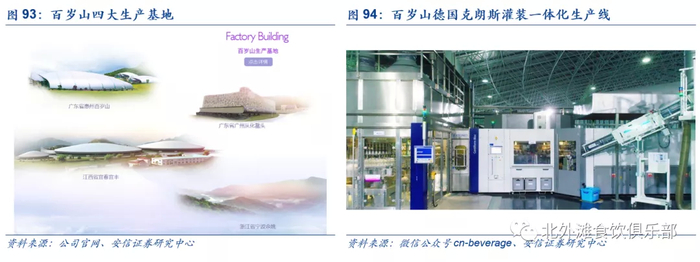 景田百岁山的大包装水产品占比较怡宝和农夫要低很多,主要因为公司战略重心向百岁山倾斜,另外公司目前产能只有厦门工厂可以生产大包装水,运输距离受到限制。根据富丰财经,截至2018年底景田产量超过240万吨,年销售额突破60亿元,公司重点的生产地区主要在广东、江西、浙江、成都等地,主要考量为矿泉水资源和周边辐射行政区域,销量地区分布南方地区和经济发达地区占比较高。百岁山生产基地主要位于罗浮山自然保护区,包括广东省惠州百岁山、广州从化鳌头、江西宜春宜丰和浙江省宁波余姚,其中惠州生产基地也是亚洲最大的生产基地,年产能超过80万吨,公司水业务生产主要以自产为主,也有OEM生产基地,包装生产线以自产为主。