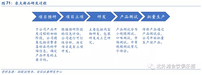 等,在项目研究阶段,农夫通过研究市场趋势和消费者需求确定新产品定位和包装,比如茶Π和果汁等产品,消费群体定位30岁以下年轻人和学生,推广方式也是找这部分消费者熟知的明星代言;根据项目研究的评估,研发人员会进行可行性分析,决定是否立项研发,研发过程主要包括内容物研发、包装研发及工艺研究,研发人员还会进行大量的市场调研,比如咨询经销商意见等。公司推出一款新品通常需要2-3年,所以会精挑细选研发项目。最后研发人员会进行产品测试,主要包括小规模测试、口味测试、市场测试、中等规模测试等,以上步骤都完成后才会批量生产。