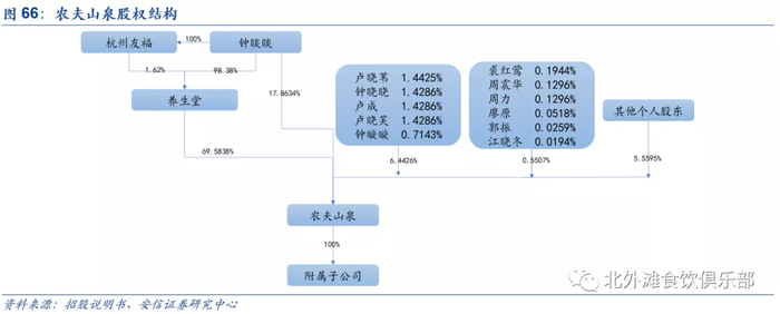 创始人钟睒睒绝对控股公司,他直接持有17.86%的农夫山泉股份,通过其控股的养生堂持有69.58%股份,其他亲友持有6.4%股份,公司管理层持股0.55%,其他个人股东共持股5.56%。钟总是公司的灵魂人物,负责品牌和市场,对公司重大决策具有最终决定权。钟总及养生堂于2019年8月及2019年12月曾将本公司约0.79%的股份转让给33名对公司发展有着杰出贡献的自然人,总代价约为4,248万元,是公司在员工股份激励机制上的一次尝试。