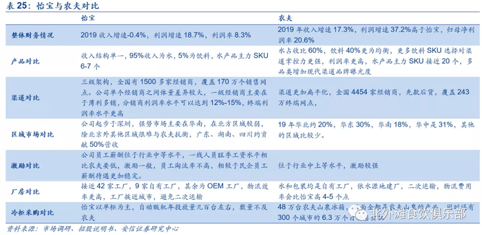 从产品来看,怡宝的收入结构相对单一,水业务贡献主要收入,饮料收入占比低,农夫的竞争策略多元化,水和饮料贡献收入相对均衡,这也使得农夫在渠道议价能力更强,对于渠道来说饮料产品的利润率水平更高;从区域市场来看,怡宝从深圳开始起步,强势市场主要在华南地区,北方相对更弱,市场份额排名第一的省份数量远低于农夫,与农夫的竞争主要集中在长江沿岸地带,在广东、湖南、广西、四川等地表现较好;渠道方面,怡宝采用三级架构,经销商数量和终端网点覆盖数要少于农夫,一级经销商的单品利润率水平要低于分销商和终端,华南地区的经销商销售规模相对较大,而农夫的经销商之间规模较为均衡,渠道更加扁平化。