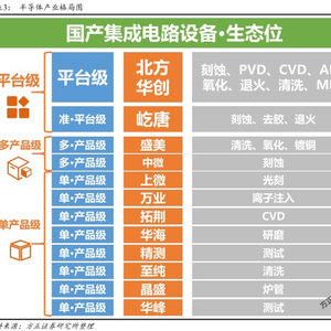 我们将设备公司分为:生态级、平台级、产品级三类。平台化是全球半导体巨头的必经之路,全球半导体设备的大部分份额都被少数几家(应用材料、LAM、TEL等)把持。