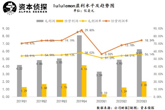 毛利方面,报告期内,lululemon毛利润为6.27亿美元,同比增长56.14%,毛利率比较稳定的维持在56.14%,经营利润率上涨至18.34%。