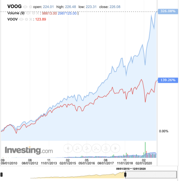 我们可以通过对比追踪标普500价值股的Vanguard的一个ETF(VOOV.US)和追踪标普500成长股的另外的一个ETF(VOOG.US)来做对比。从数据来看,它两者之间的差距已经是10年来的最大值。在短期内,会不会看到这两者之间会出现一定程度上的均值回归,是值得大家去关注、去考量的一个细节。