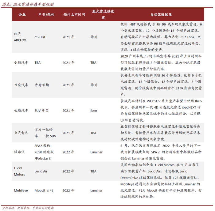华为激光雷达性能优良,搭载车型有望于2021年上市,开启量产元年。华为本次发布的96线中长距激光固态雷达具备150米视场测距,120°×25°视场角和25Hz高频率,计划打造为符合中国复杂路况的高性价比产品。为满足严苛使用条件下的车规级要求,该产品通过了高低温湿热、水压、振动、盐雾、人眼安全、EMC(电磁兼容)、碎石冲击等场景的测试,并具备130km/h高速下清洗和智能加热融冰能力。华为在发布会上介绍,公司已建立了第一条车规级激光雷达的Pilot产线,面向百万级量产需求,并按照年产10万套/线在推进,以适应未来大规模量产需求。而北汽ARCFOX极狐αS-HBT成为全球首款搭载华为车规级激光雷达的车型,公司计划于2021年推出,开启车规级激光雷达量产元年。