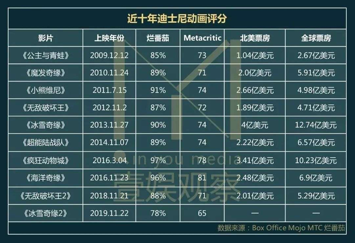 去年11月,《冰雪奇缘2》上映,而上映前夕,此片在北美陷入了负面口碑之中,烂番茄新鲜度78%,Metacritic仅有65分,是迪士尼动画近十年作品最差成绩。名利场杂志影评辛辣点评道,“《冰雪奇缘2》是迪士尼的败笔”、“这部续集完全没有必要,除非它的职责是满足资本的需求”。