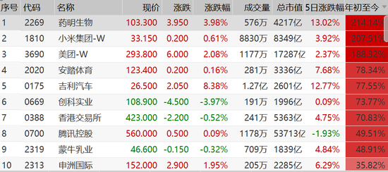 恒指成份股来看,新纳入恒指的药明生物、小米、美团股价纷纷翻倍,成为恒指表现最好的股票。腾讯、港交所、安踏、吉利等也涨幅翻倍。中信股份跌超40%,成为表现最差蓝筹。中海外、中海油也跌40%,分列跌幅榜亚军和季军。此外,汇丰、长和、中国移动跌幅居前。