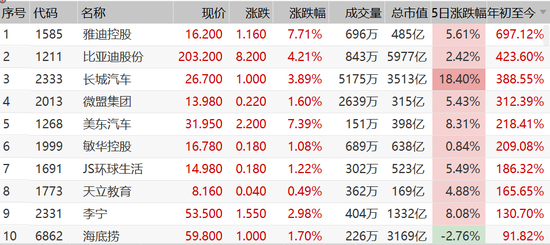 消费股方面,汽车股一骑绝尘,比亚迪涨超6倍,比亚迪涨超4倍,长城汽车涨380%,李宁、微盟等翻倍。而中通汽车跌69%,成为最差汽车股。
