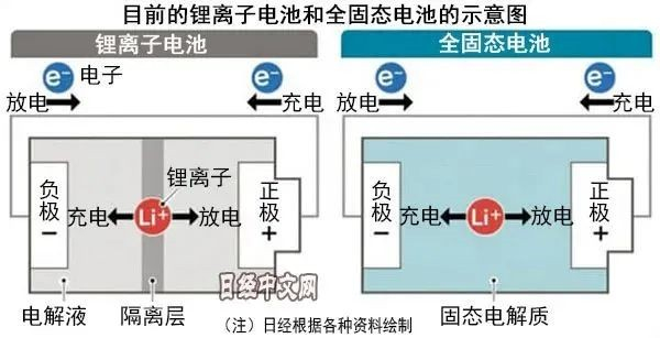 固态电池的充放电原理和液态电池相同,唯一不同的是它的电解质为固态,它相对于液态电解质拥有诸多优势: