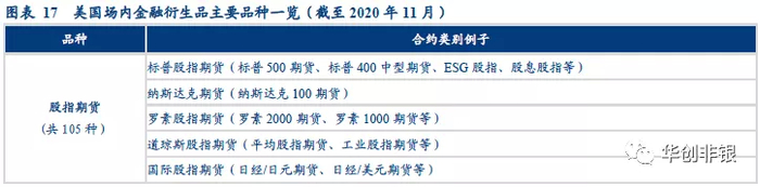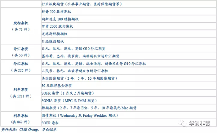 美国场内金融衍生品业务主要集中于CME集团旗下,以芝加哥交易所为主的交易所开展。相较于国内以股指期货为主、而利率期货与股指期权占比较低的现状,美国场内金融衍生品品种较为丰富。截至2020年11月,美国场内金融衍生品合约品种共计2527种,合约总数占到全球的40%以上,股指、外汇、利率期权期货等各类品种齐全。