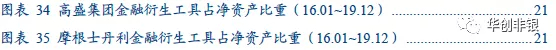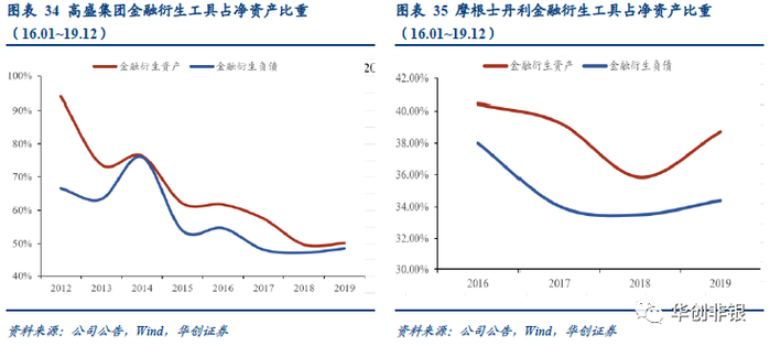 以高盛集团和摩根士丹利为例,2016年以来金融衍生资产占净资产比例在35%以上,金融衍生负债占比在30%以上,开展以客需为基础的衍生品业务以赚取低风险收益,有力地提升了ROE的稳定程度。回顾国内40家上市券商,2019年金融衍生资产及金融衍生负债平均占净资产的比重0.64%及0.98%,其中中金公司占比最高,分别为9.28%及13.11%,相较于国际顶尖投行仍有较大的发展空间。