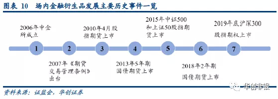 2007年4月,《期货交易管理条例》出台,金融衍生品市场专门监管正式启动。2010年4月国内首个股指期货沪深300股指期货上市。2013年重新推出5年期国债期货。2015年10年期国债期货、中证500和上证50股指期货上市。2018年8月2年期国债期货上市。2019年底,首个沪深300股指期权上市。