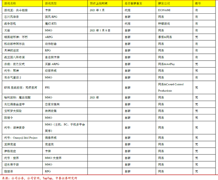 2)研发周期拉长,走向精品化、系列化:行业由于主动(用户红利消退,竞争加剧,中小公司大量淘汰,头部公司收缩游戏数量)与被动(版号审批放缓)去产能,每年的上线产品数量不断减少,网易+腾讯2019~2020年共计获取102款版号,但上线的游戏两年加起来仅有61款,产品研发周期拉长,数量下降质量提升,收入持续增长。网易围绕阴阳师IP在不断打造相关产品矩阵,今年推出了《阴阳师:妖怪屋》,2018年上线了Moba手游《决战平安京》,2019年上线了《阴阳师:百闻牌》,以及目前在研的阴阳师IP传承项目《代号:Onmyoji Idol Project》、《代号:世界》等。腾讯在《王者荣耀》IP上也下了不少功夫,今年推出了《代号:破晓》和《代号:启程》两款基于《王者荣耀》IP的在研产品。