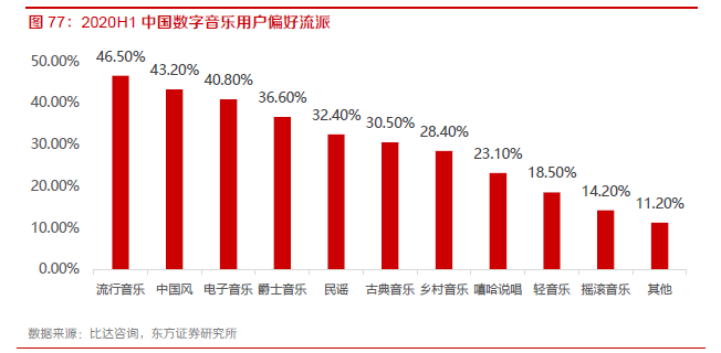 根据比达咨询,2020年中国数字音乐用户将达7.8亿,2020年H1网易云音乐35岁以下用户占比84.1%,我们选取中国数字音乐用户中35岁以下用户作为网易云音乐的可获取用户基数。而网易云音乐音乐定位更接近ACG+国风,用户偏好流派中“中国风”占比43.2%。