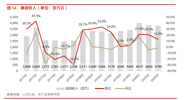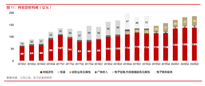 20Q3网络游戏业务收入为138.62亿元,占比74%。,随着19年考拉业务的剥离,网易重新聚焦游戏主业,新上线手游《梦幻西游网页版》、《阴阳师:妖怪屋》拉动增长,《荒野行动》日本表现强劲。