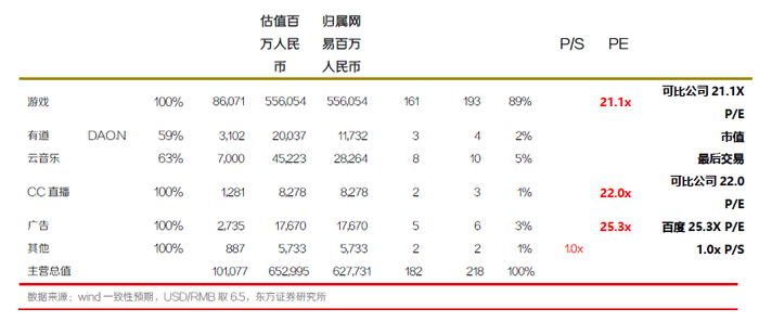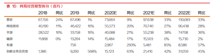 有道业务:20H1收入为15亿,毛利率为45%。基于网易有道在产品和营销的大力投入,我们预计有道20E/21E/22E收入为30/55/86亿元。