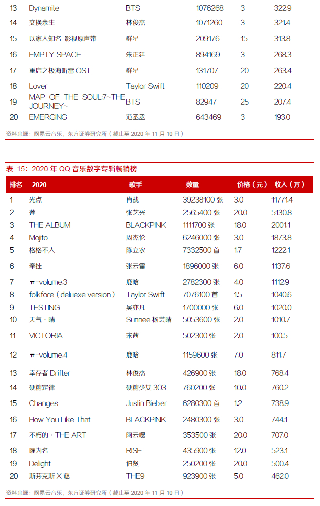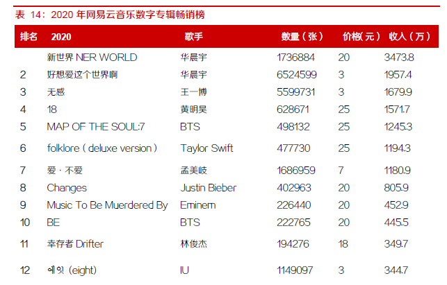 截至2020年11月10日,2020年网易云音乐数字专辑销量榜前20位的总销售收入为1.6亿,榜单中多张数字专辑的收入达到千万量级。