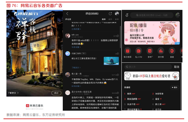 网易云音乐通过深度社交引导付费,其评论数量和质量均在行业内处于领先位置,用户在听歌的同时通常有浏览评论区习惯,增加了广告的曝光率和点击率。除了开屏广告、首页广告等主要的广告形式,评论区也成为网易云音乐信息流广告的良好展示点。