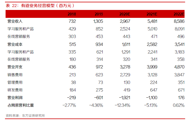 有道亏损率提高:虽然有道收入大幅提振,但运营费用尤其是销售费用超出预期或导致亏损进一步加强。我们预计有道业务20年将亏损19亿,21年亏损11亿,22年实现扭亏。
