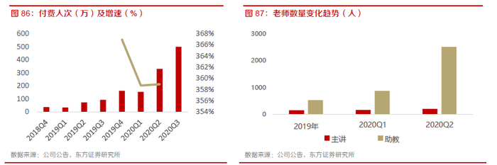 教育板块毛利率显著提升,成本结构改善。公司进行教师薪酬体系的改革,同时受益于在线大班模式的规模效应,公司毛利率迎来拐点,2020Q1/Q2/Q3毛利率达到43.5%/45.2%/45.9%,同比大幅提升20.1%/12.3%/20.1%。卫生事件期间,公司在师资上进行了大规模投入,提升教学和服务体验。主讲和助教老师共2699人,助教老师超2500人,同时在西安、南京、广州、深圳和成都先后建立起辅导老师基地,因此前置成本一定程度拉低毛利率提升幅度,后续毛利率提升将更为显著。