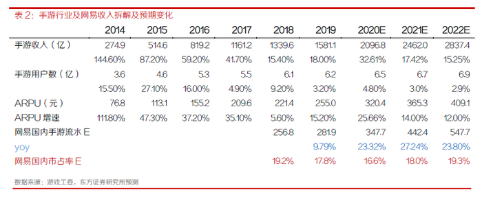 3)21、22年国内手游市场收入由于大产品驱动预期仍稳定增长,增速有望超17%/15%,网易管线丰满国内市占率有望提升。网易19年国内手游市场市占率约为17.8%,20~22年市占率预测为16.6%/18.0%/19.3%。